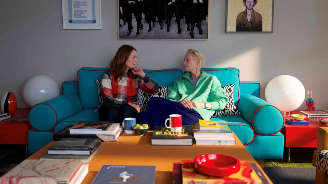 Total Film praised Almodóvar’s choice of color palette for his latest feature, as well as Swinton and Moore’s performances. “‘The Room Next Door’ is filled with color [pistachio sun loungers, pink snowflakes, rust-colored leaves, and, of course, pops of signature red], not to mention jolts of passion, rage, ambition, lust, hurt, and intrigue,” they wrote. “Deftly navigating a script that takes in poetry, John Huston films, and environmental concerns, Moore and Swinton excel as accomplished women who worry about their failings.”