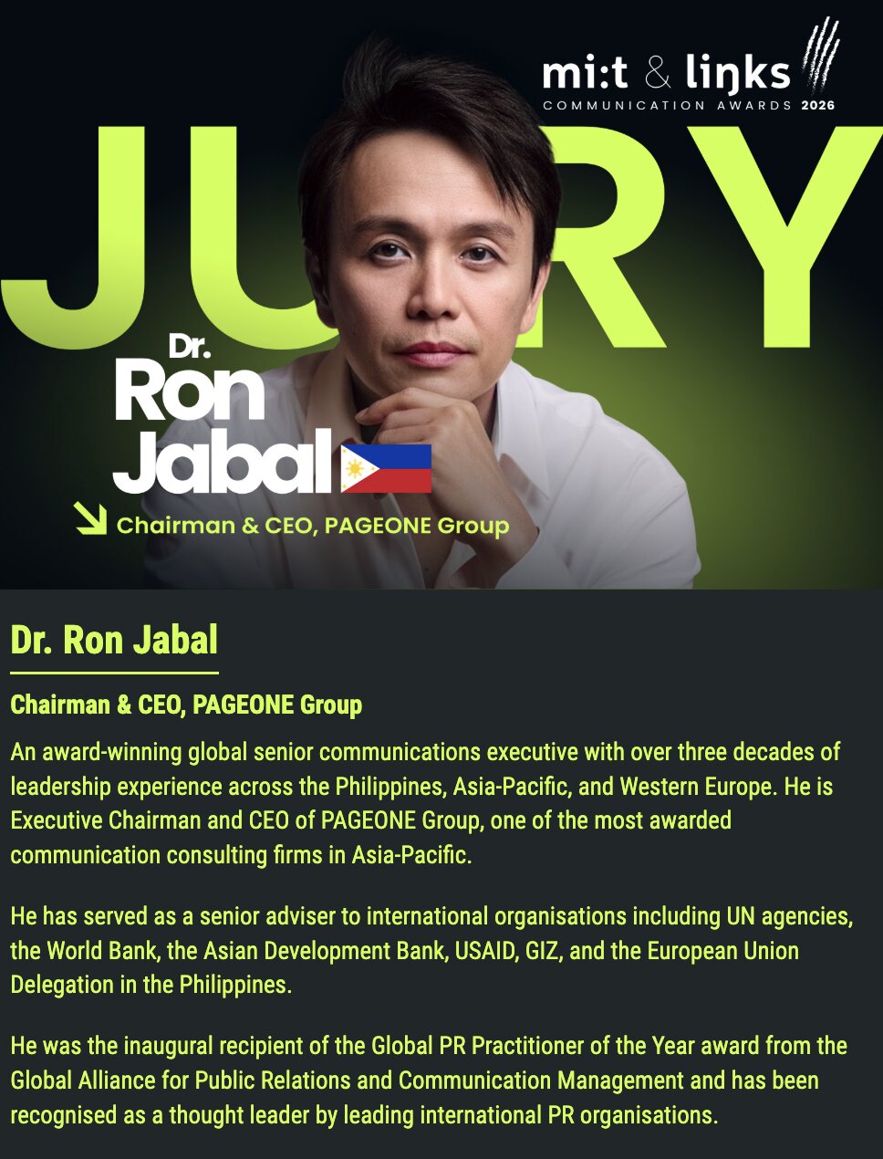 Dr. Ron F. Jabal, APR Chairman and CEO of PAGEONE Group has been selected as a member of the international jury for the Mi:t&Links Baltic Communication Awards 2026, one of the most respected communication industry competitions in the Baltic Sea region.